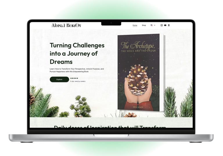 This site features an online shop with links to the Amazon bookstore, options to toggle between English and Spanish, and embedded content from YouTube and Instagram.